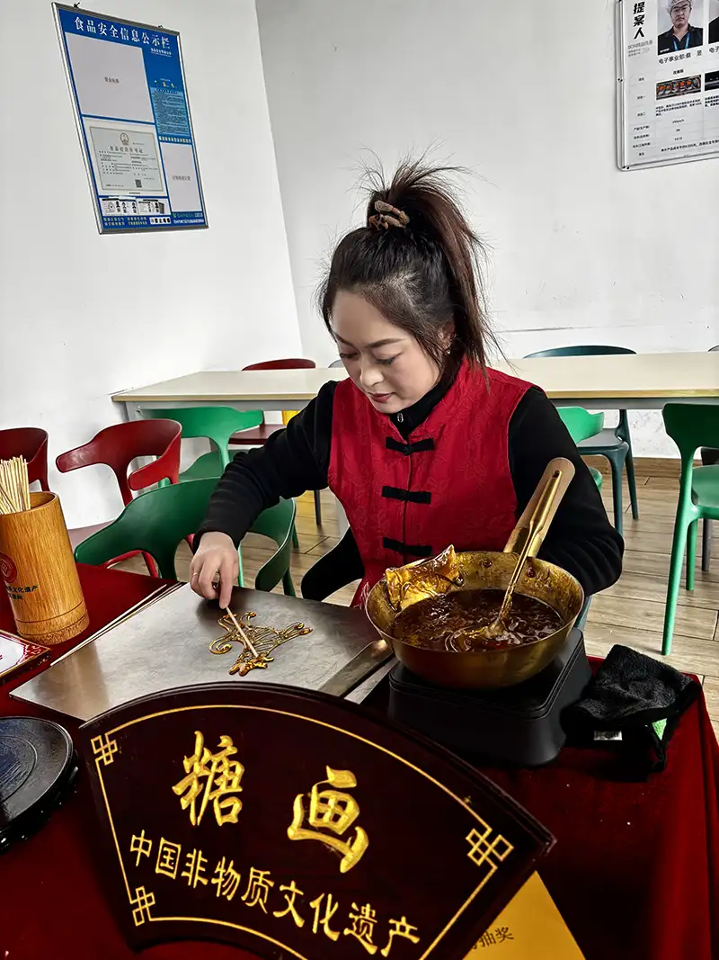 活动现场,糖画艺人手持铜勺,舀起融化的金黄糖汁,手腕轻转、起落间,十二生肖、卡通人物等图案跃然石板之上,转瞬凝成晶莹剔透、可赏可食的糖画作品,甜香四溢,引得众人驻足围观、争相体验。